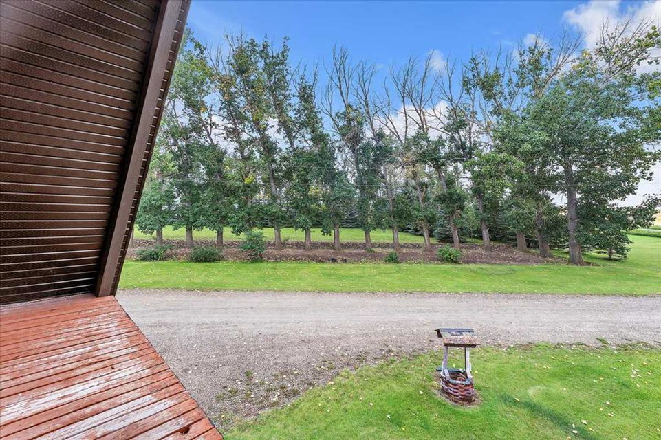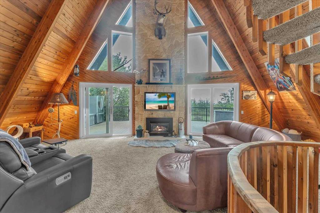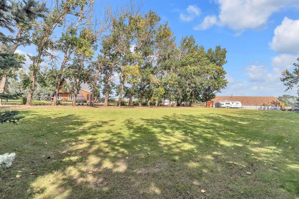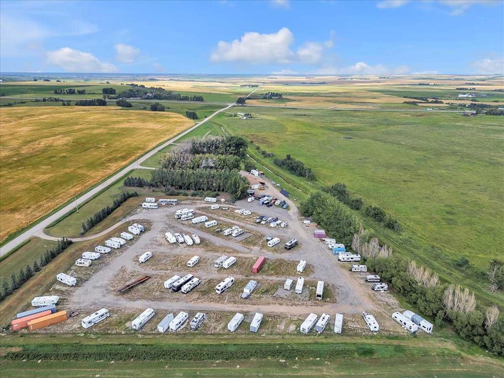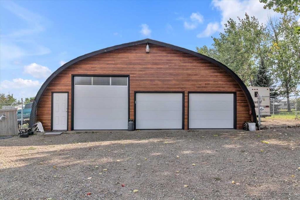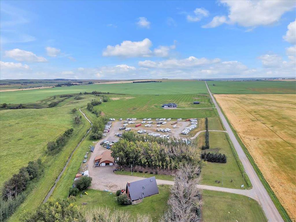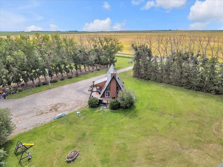 Country Lifestyle with Income Potential! Set on 10.75 acres, this unique property offers Country Living and RV Storage Business Opportunity. Nestled among mature trees and minutes from Strathmore, this unique A-frame home features over 3300 sq.ft. of living space, 4 bedroom, 3 baths, spiral staircase, cedar wood, skylights & large windows that enhance natural light and views. Main floor offers a spacious kitchen, dining, sunken living room, wet bar, rock facing gas fireplace and large windows invite natural light, creating a warm and inviting living space. Plus, laundry and 2 bedrooms with deck access. The wrap around deck off the living room & kitchen offers plenty of space to enjoy the outdoors & views of the surrounding countryside. Upstairs, the loft bonus room overlooks the living room, while the primary suite offers built-in storage, a 3 pc ensuite and a private balcony. The walk-up basement is fully developed with a large rec/games room, flex room, bedroom and storage room. Ideal for family living or entertaining! Upgrades include, hardy board siding, metal roof, skylights, windows and patio doors. Nicely landscaped yard with mature trees, fruit trees & bushes, garden & fire pit area, chicken/duck coop, shed, pump house and underground sprinkler system and with access to the water canal makes irrigations simple. 40×80 heated Quonset with mezzanine, is designed with versatile in mind, with 3 bays, in-floor heat front & rear bay, middle bay workshop, workbench, sink with cold water, forced air, storage room, utility room. Plenty of room for tools, supplies and year round projects. The 12ft garage door provides easy access for large equipment, RVs or recreational vehicles. Plus, an exterior lean-to storage area. Recent upgrades include, metal man door & garage doors. A 22 panel solar system is in place, offering energy efficiency. Five acres are set up as a Turnkey RV Storage Business, accommodating up to 200 units with fencing and separate entrance, creates excellent income potential. Whether you’re seeking a Country Lifestyle, Retreat Close to Town, a Versatile Shop Space or a Ready to go Income Property, this Acreage Property Delivers All!
