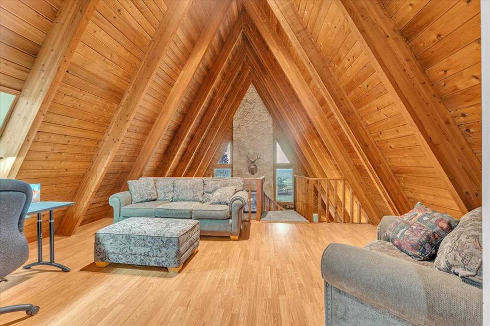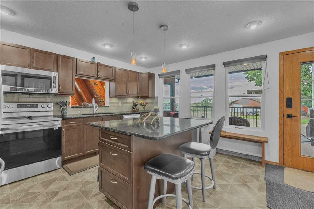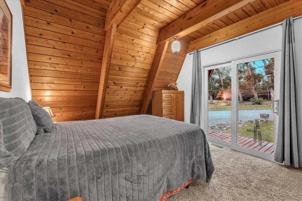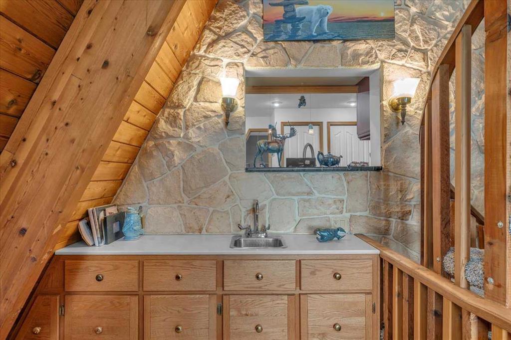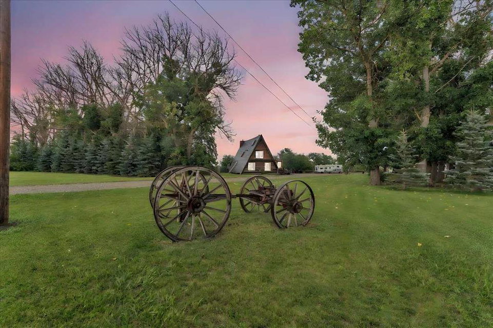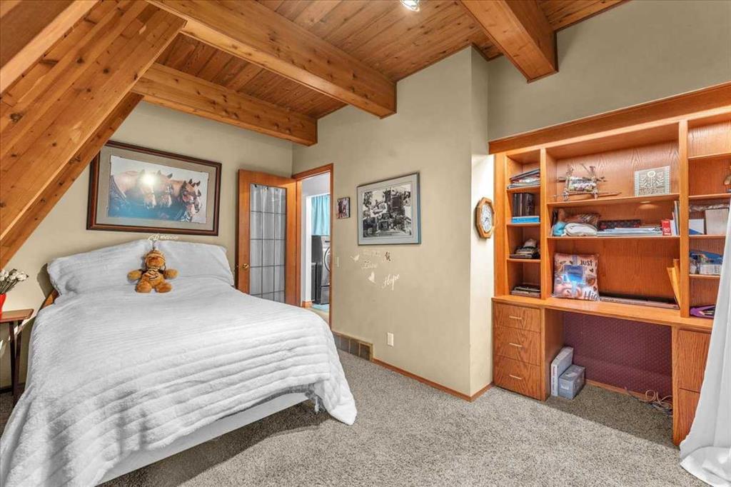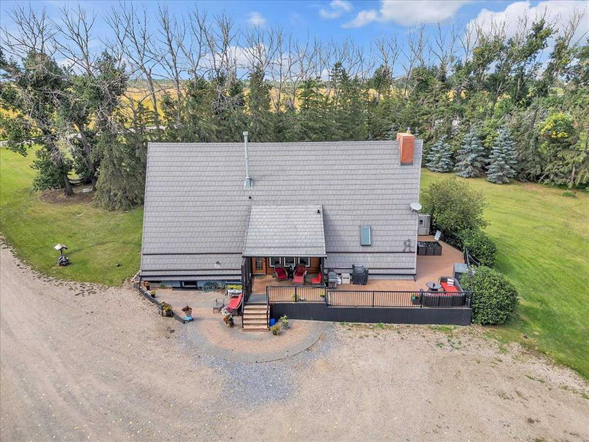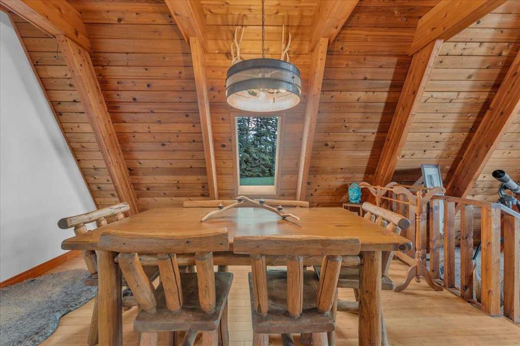 Country Lifestyle with Income Potential! Set on 10.75 acres, this unique property offers Country Living and RV Storage Business Opportunity. Nestled among mature trees and minutes from Strathmore, this unique A-frame home features over 3300 sq.ft. of living space, 4 bedroom, 3 baths, spiral staircase, cedar wood, skylights & large windows that enhance natural light and views. Main floor offers a spacious kitchen, dining, sunken living room, wet bar, rock facing gas fireplace and large windows invite natural light, creating a warm and inviting living space. Plus, laundry and 2 bedrooms with deck access. The wrap around deck off the living room & kitchen offers plenty of space to enjoy the outdoors & views of the surrounding countryside. Upstairs, the loft bonus room overlooks the living room, while the primary suite offers built-in storage, a 3 pc ensuite and a private balcony. The walk-up basement is fully developed with a large rec/games room, flex room, bedroom and storage room. Ideal for family living or entertaining! Upgrades include, hardy board siding, metal roof, skylights, windows and patio doors. Nicely landscaped yard with mature trees, fruit trees & bushes, garden & fire pit area, chicken/duck coop, shed, pump house and underground sprinkler system and with access to the water canal makes irrigations simple. 40×80 heated Quonset with mezzanine, is designed with versatile in mind, with 3 bays, in-floor heat front & rear bay, middle bay workshop, workbench, sink with cold water, forced air, storage room, utility room. Plenty of room for tools, supplies and year round projects. The 12ft garage door provides easy access for large equipment, RVs or recreational vehicles. Plus, an exterior lean-to storage area. Recent upgrades include, metal man door & garage doors. A 22 panel solar system is in place, offering energy efficiency. Five acres are set up as a Turnkey RV Storage Business, accommodating up to 200 units with fencing and separate entrance, creates excellent income potential. Whether you’re seeking a Country Lifestyle, Retreat Close to Town, a Versatile Shop Space or a Ready to go Income Property, this Acreage Property Delivers All!